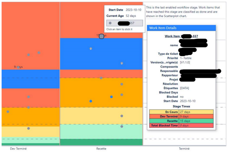 - Les couleurs représentent ces mêmes percentiles (vert foncé <50%, vert clair <70%, jaune clair <85%, orange <95%, rouge >95%) mais par temps passé (historiquement) au sein de l'état même du workflow. Par exemple pour rendre cela plus clair : 50% des tickets historiques étaient dans l'état "Recette" après 3 jours ou moins de circulation dans le workflow, 85% des tickets historiques étaient dans l'état "Dev Terminé" après 18 jours ou moins de circulation dans le workflow...