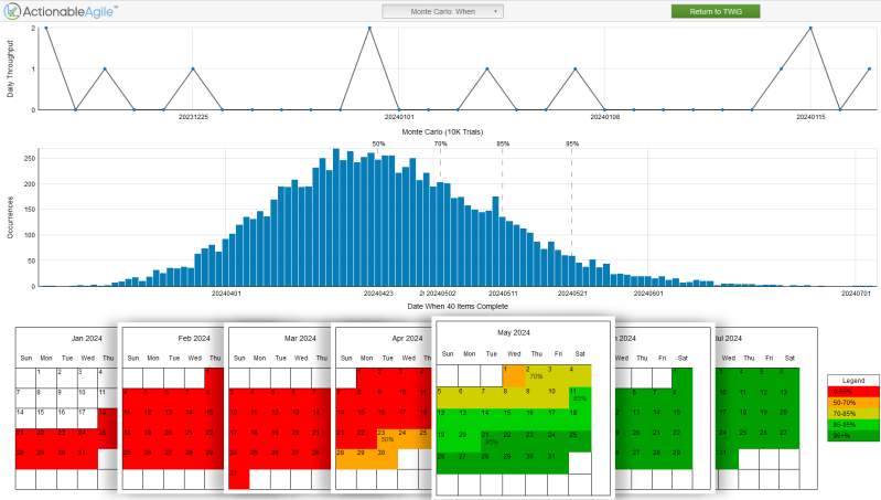 Maintenant, prenez le débit historique par jour des éléments, faites une simulation de Monte-Carlo avec cet historique en vous remettant à la date de démarrage et avec le nombre d'éléments que vous aviez imaginé au début de cette release.
